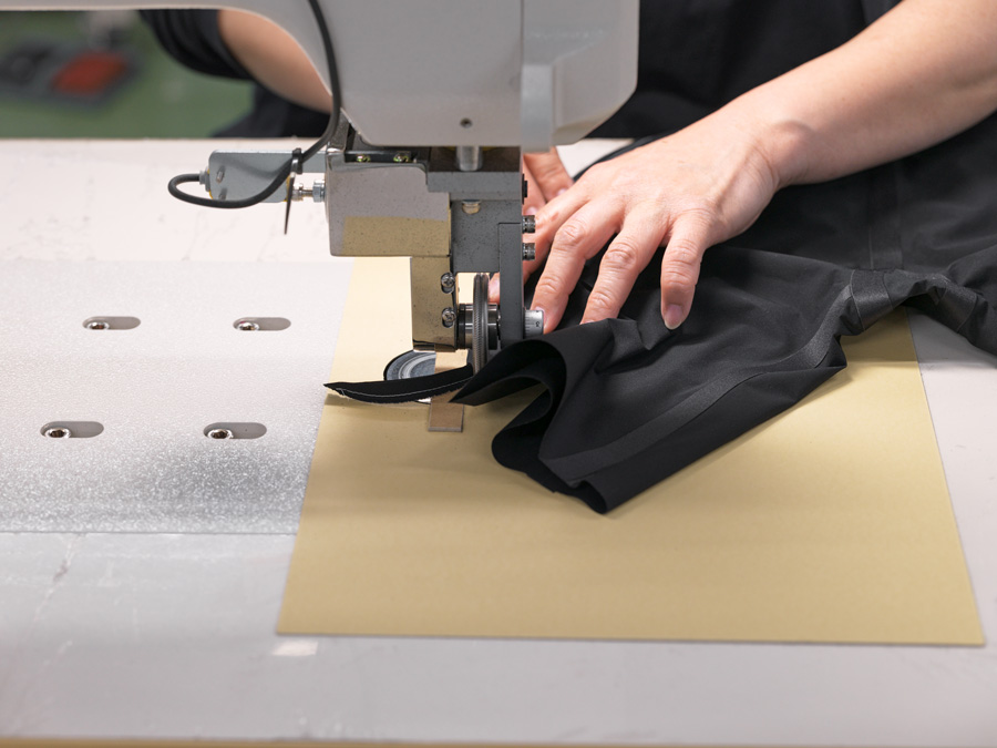 糸で仮留めした後、超音波で接着。そのあとシリコンテープで補強し、最後にプレスをかける。股部分のフィッティングは、選手の間でも評判が良い。